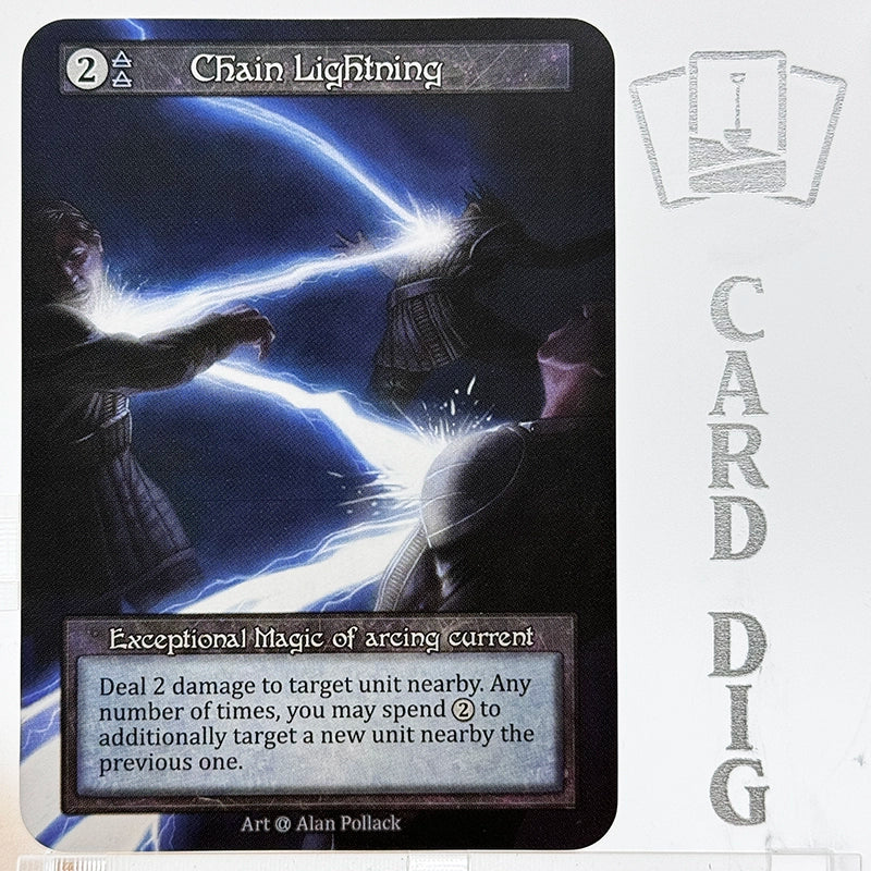 Text Box: Deals 2 damage to target unit nearby. Any number of times, you may spend 2 (mana) to additionally target a new unit nearby the previous one.